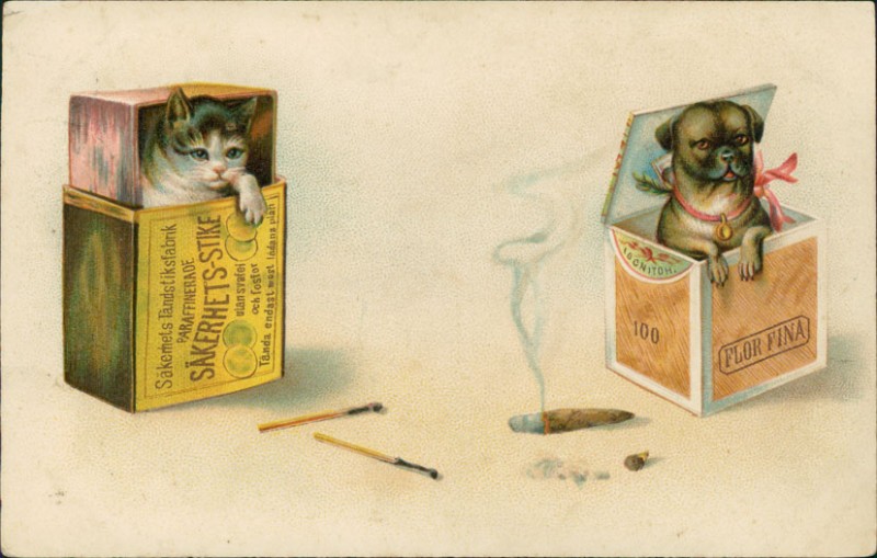 Katze in Streichholzschachtel und Hund in Zigarrenkiste