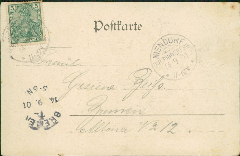 Alte Ansichtskarte aus Hamburg-Niendorf, gelaufen am 14.09.1901 von Niendorf (Kr. Pinneberg) nach Bremen. Ankunft in Bremen am 14.09.1901.