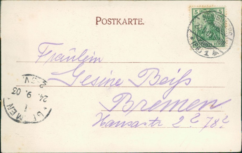 Alte Ansichtskarte aus Königsberg / Kaliningrad, gelaufen am 22.09.1903 von Königsberg (Pr.) nach Bremen. Ankunft in Bremen am 24.09.1903.