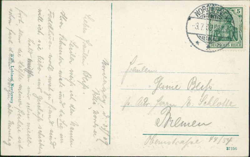 Alte Ansichtskarte aus Norderney, gelaufen am 03.07.1909 von Norderney nach Bremen.