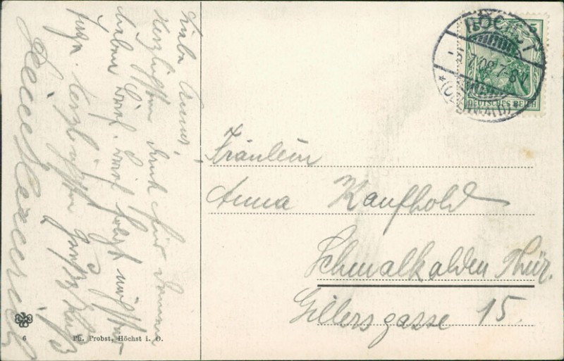 Alte Ansichtskarte aus Höchst i. Odw., gelaufen am 05.07.1908 von Höchst (Odenwald) nach Schmalkalden.