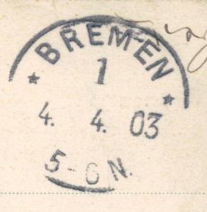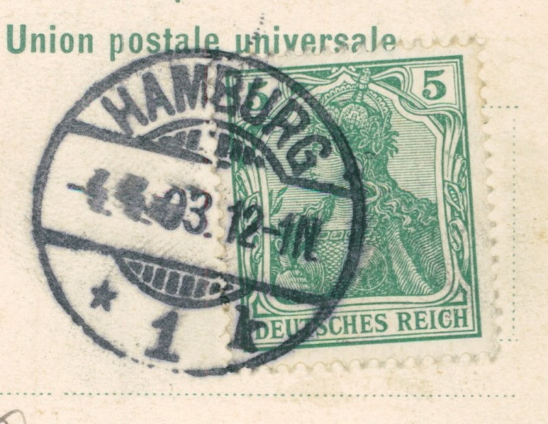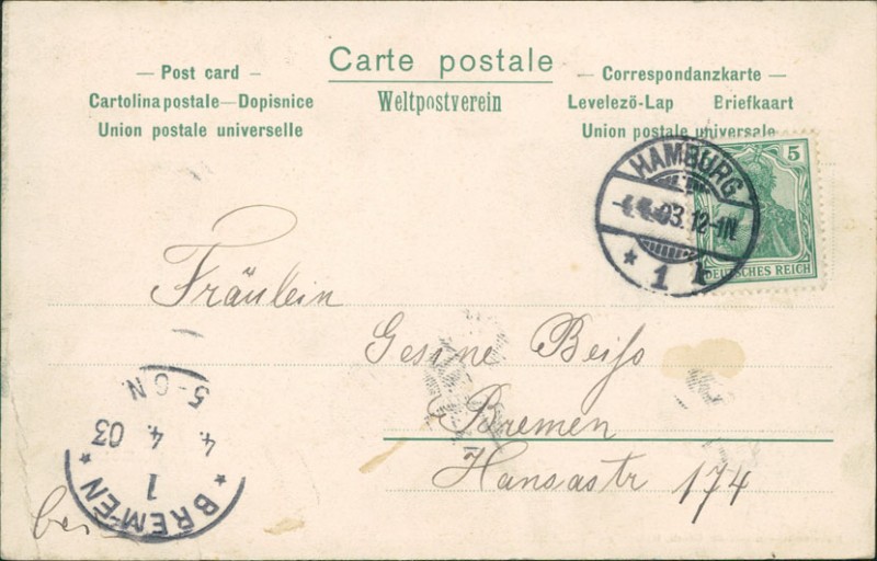 Alte Ansichtskarte aus Hamburg, gelaufen am 04.04.1903 von Hamburg nach Bremen. Ankunft in Bremen am 04.04.1903.