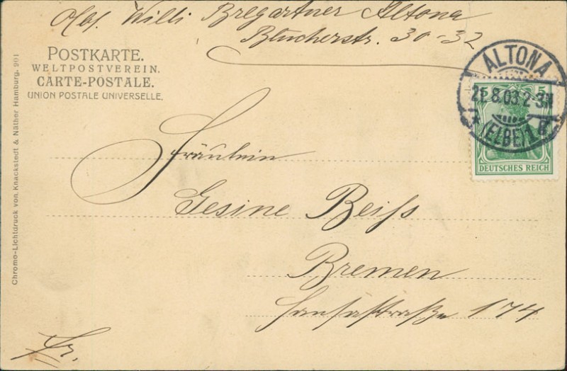 Alte Ansichtskarte aus Hamburg-Altona, gelaufen am 21.08.1903 von Altona (Elbe) nach Bremen.