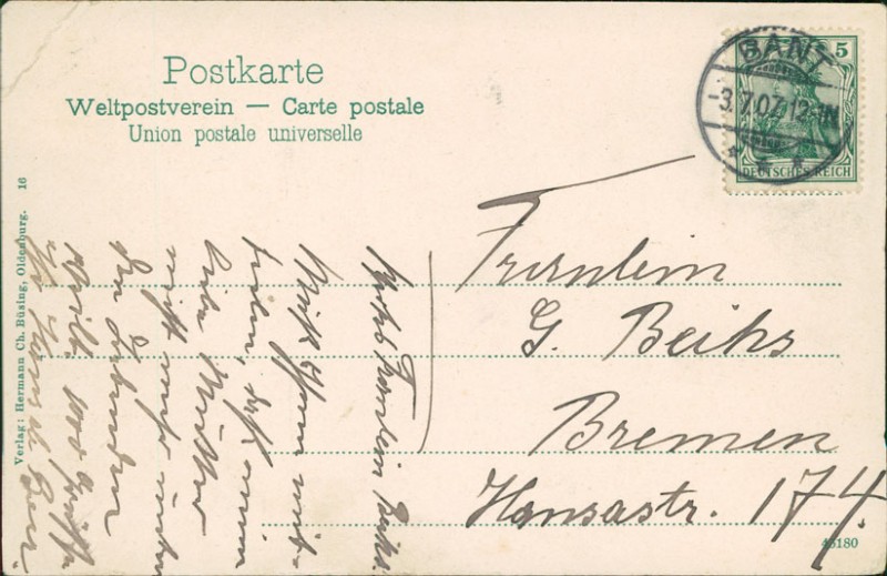 Alte Ansichtskarte aus Wilhelmshaven, gelaufen am 03.07.1907 von Bant nach Bremen.