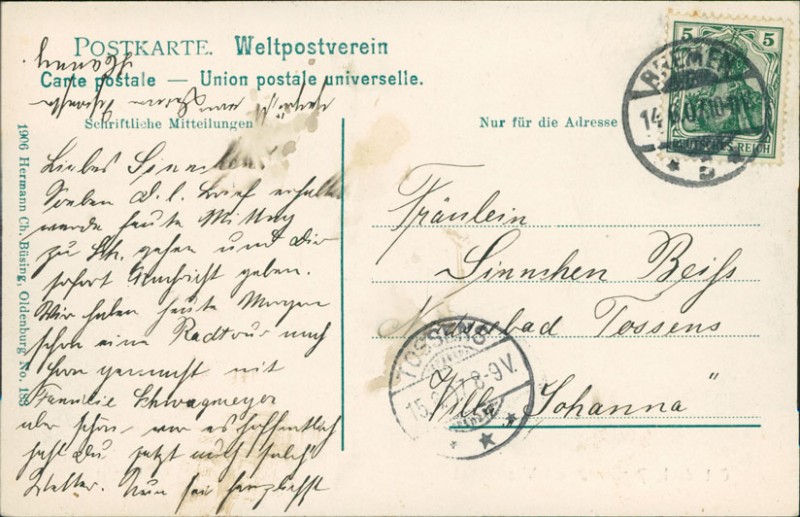 Alte Ansichtskarte aus Bremen, gelaufen am 14.06.1907 von Bremen nach Tossens. Ankunft in Tossens am 15.06.1907.