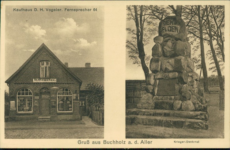 Kaufhaus D. H. Vogeler. Fernsprecher 64, Krieger-Denkmal