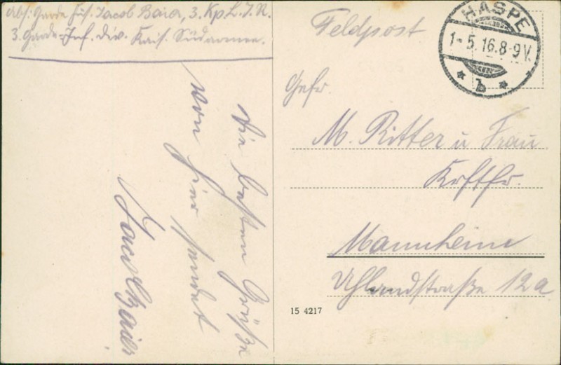 Alte Ansichtskarte aus Hagen-Haspe, gelaufen am 01.05.1916 von Haspe nach Mannheim.