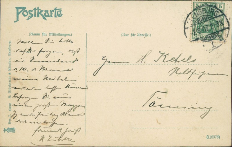 Alte Ansichtskarte aus Flensburg, gelaufen am 07.08.1907 von Flensburg nach Tönning.