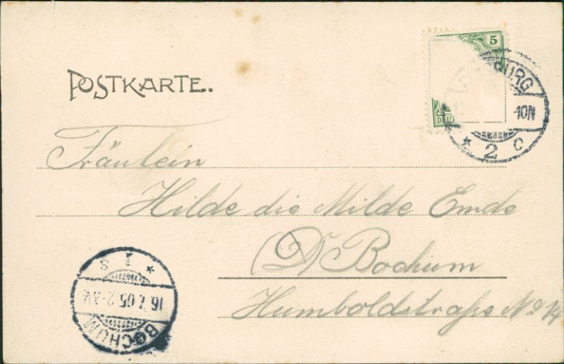 Alte Ansichtskarte aus Duisburg, gelaufen um 1905 von Duisburg nach Bochum.