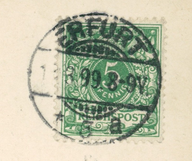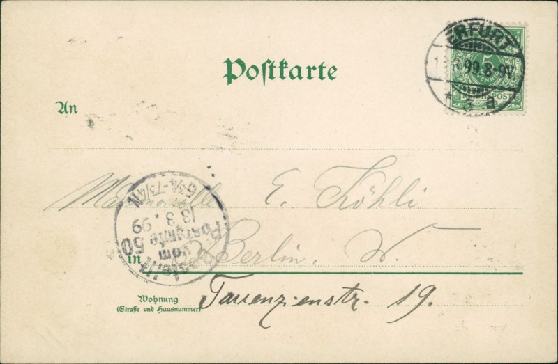 Alte Ansichtskarte aus Erfurt, gelaufen am 13.03.1899 von Erfurt nach Berlin. Ankunft in Berlin am 13.03.1899.