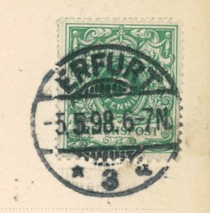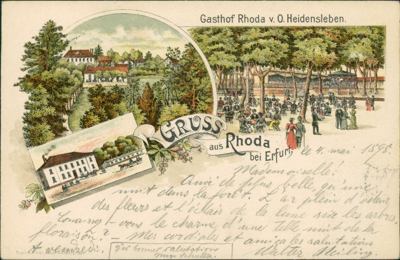 Alte Ansichtskarte aus Erfurt-Rhoda, gelaufen am 05.05.1898 von Erfurt nach Erfurt. Ankunft in Erfurt am 05.05.1898.
