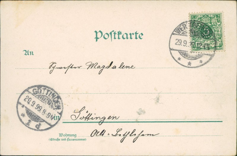 Alte Ansichtskarte aus Wernigerode, gelaufen am 29.09.1899 von Wernigerode nach Göttingen. Ankunft in Göttingen am 29.09.1899.