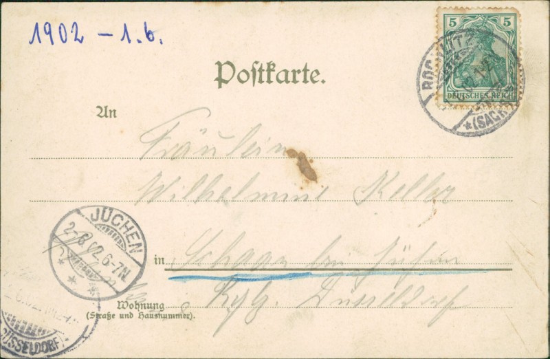 Alte Ansichtskarte aus Lunzenau, gelaufen am 01.06.1902 von Rochlitz nach Jüchen. Ankunft in Jüchen am 02.06.1902.