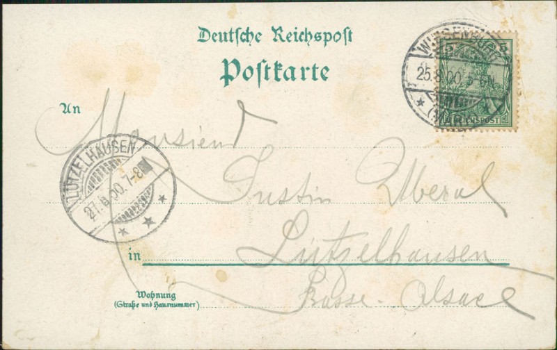 Alte Ansichtskarte aus Wiesenburg/Mark, gelaufen am 25.08.1900 von Wiesenburg (Mark) nach Lützelhausen. Ankunft in Lützelhausen am 26.08.1900.