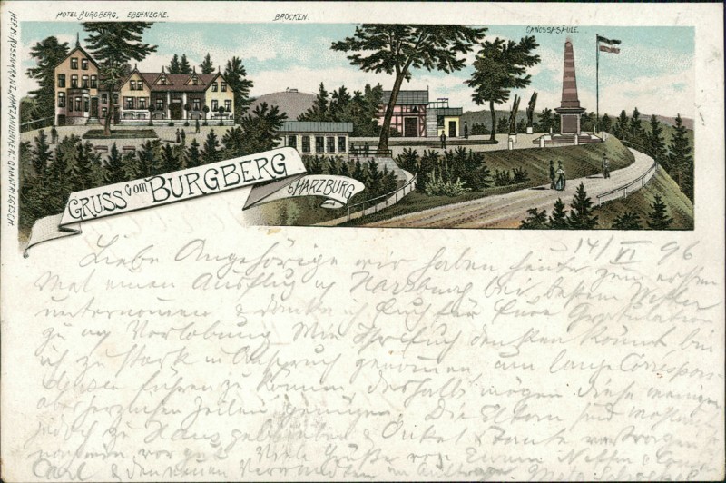 Alte Ansichtskarte aus Bad Harzburg, gelaufen am 15.06.1896 von Harzburg nach Zürich. Ankunft in Zürich am 16.06.1896.