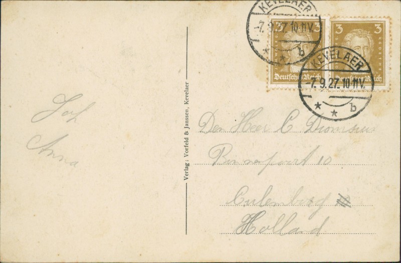 Alte Ansichtskarte aus Kevelaer, gelaufen am 07.09.1927 von Kevelaer nach Culemborg.