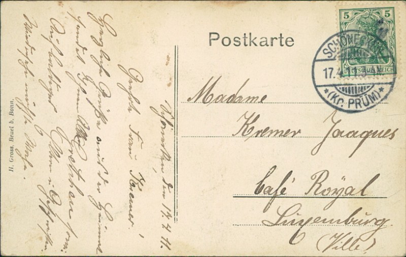 Alte Ansichtskarte aus Schönecken, gelaufen am 17.04.1911 von Schönecken (Kr. Prüm) nach Luxemburg.