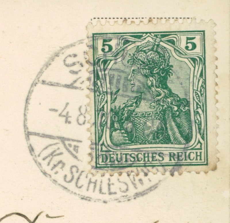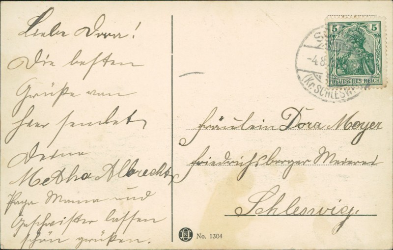 Alte Ansichtskarte aus Arensharde, gelaufen am 04.08.1910 von Schuby (Kr. Schleswig) nach Schleswig.
