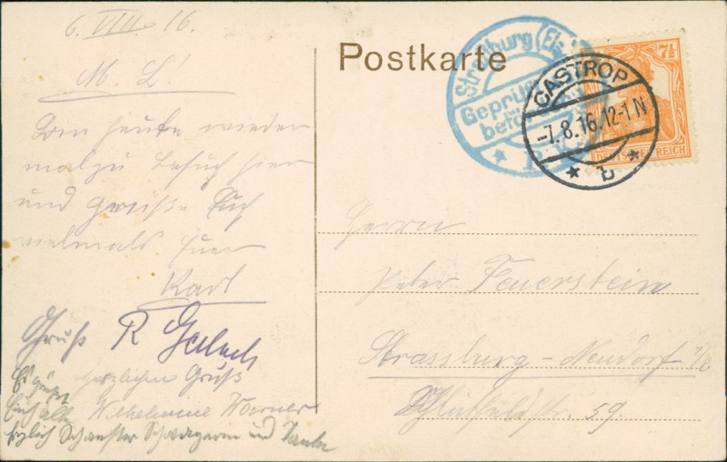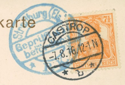 Alte Ansichtskarte aus Castrop-Rauxel, gelaufen am 07.08.1916 von Castrop nach Strassburg-Neudorf.