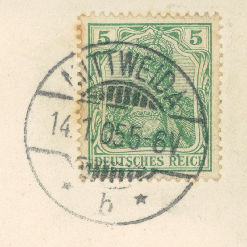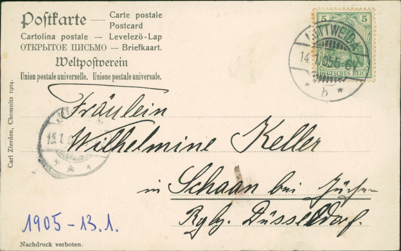 Alte Ansichtskarte aus Mittweida, gelaufen am 14.01.1905 von Mittweida nach Schaan bei Jüchen. Ankunft in Schaan bei Jüchen am 15.01.1905.