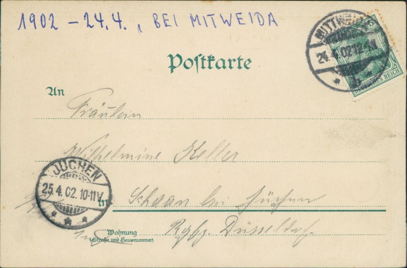 Alte Ansichtskarte aus Mittweida-Lauenhain, gelaufen am 24.04.1902 von Mittweida nach 25.04.1902.