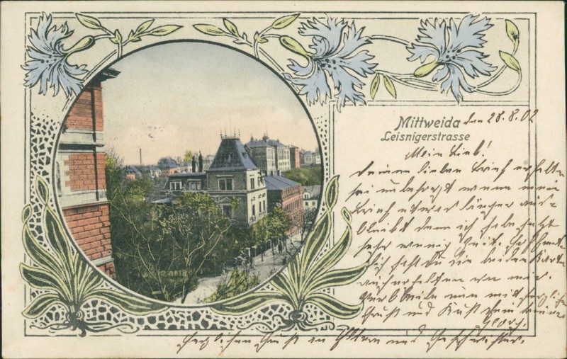 Alte Ansichtskarte aus Mittweida, gelaufen am 28.08.1902 von Mittweida nach Schaan bei Jüchen. Ankunft in Schaan bei Jüchen am 29.08.1902.