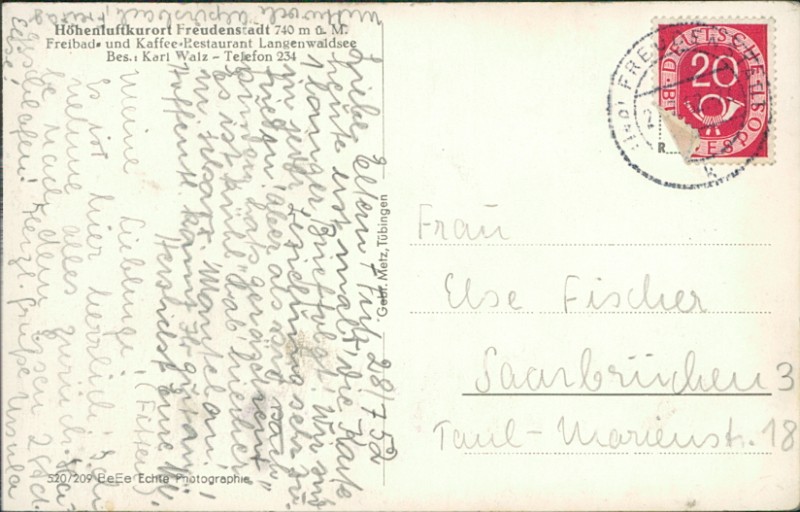 Alte Ansichtskarte aus Freudenstadt, gelaufen am 28.07.1952 von Freudenstadt nach Saarbrücken 3.