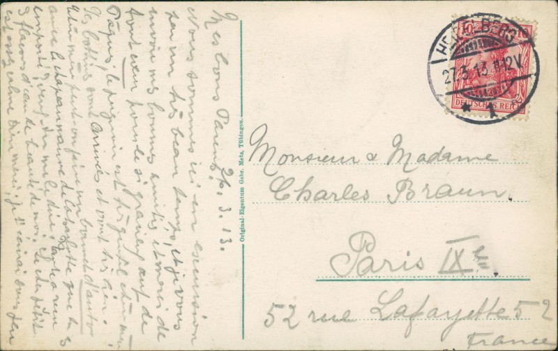Alte Ansichtskarte aus Heidelberg, gelaufen am 27.03.1913 von Heidelberg nach Paris.