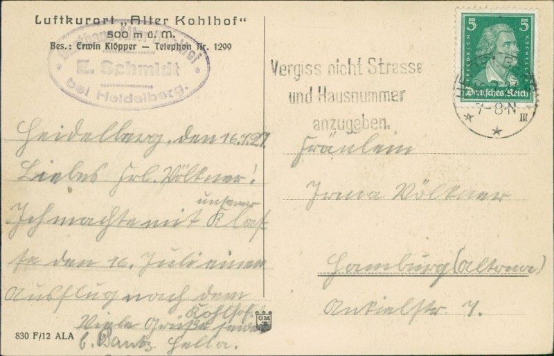 Alte Ansichtskarte aus Heidelberg, gelaufen am 16.07.1927.