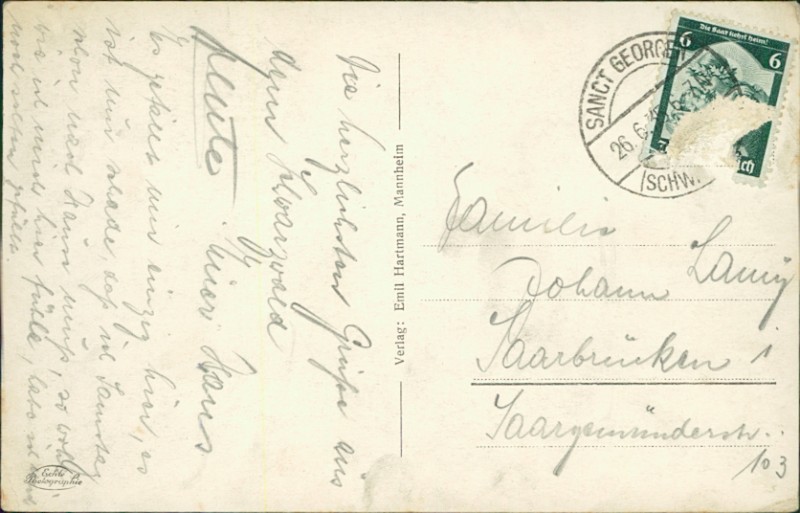 Alte Ansichtskarte aus St. Georgen, gelaufen am 26.06.1935 von Sanct Georgen (Schwarzwald) nach Saarbrücken.