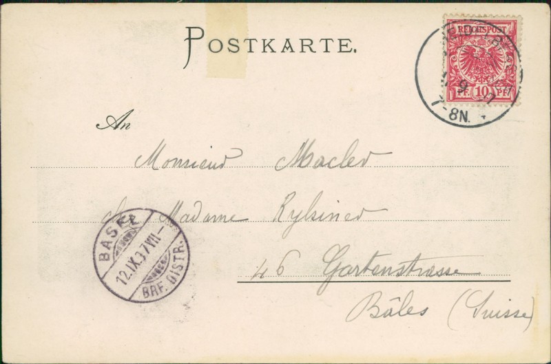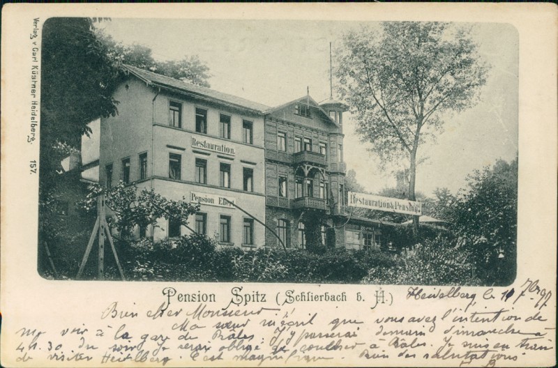 Alte Ansichtskarte aus Heidelberg-Schlierbach, gelaufen am 11.09.1897 von Heidelberg nach Basel. Ankunft in Basel am 12.09.1897.