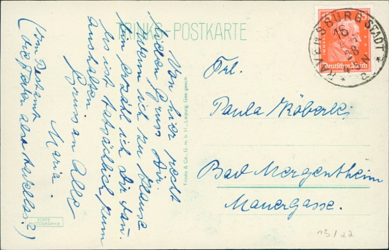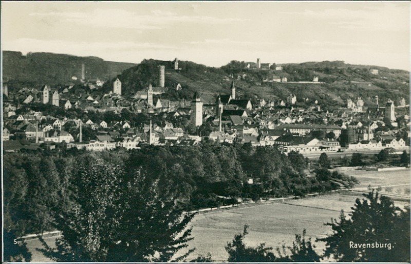 Alte Ansichtskarte aus Ravensburg, gelaufen am 16.08.1928 von Ravensburg nach Bad Mergentheim.