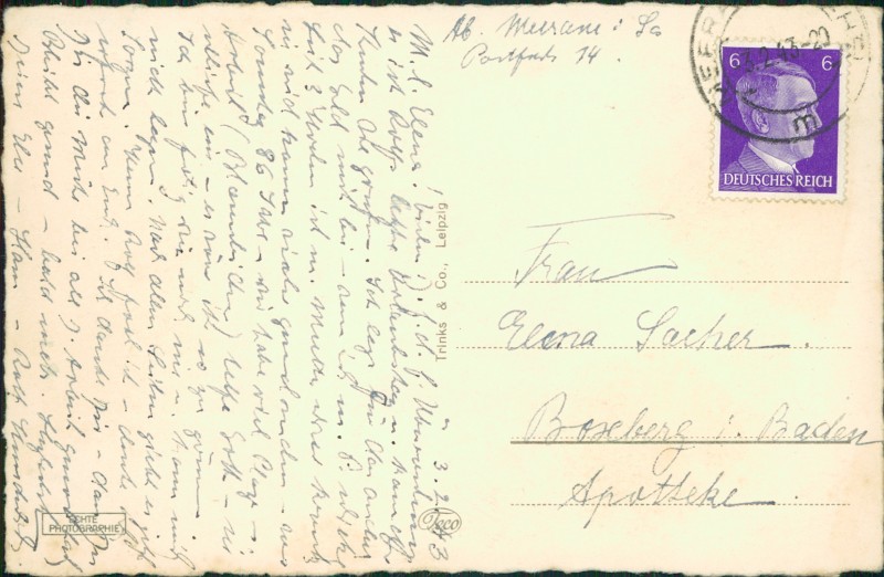 Alte Ansichtskarte aus Meerane, gelaufen am 03.02.1943 von Meerane (Sachs) nach Boxberg i. Baden.