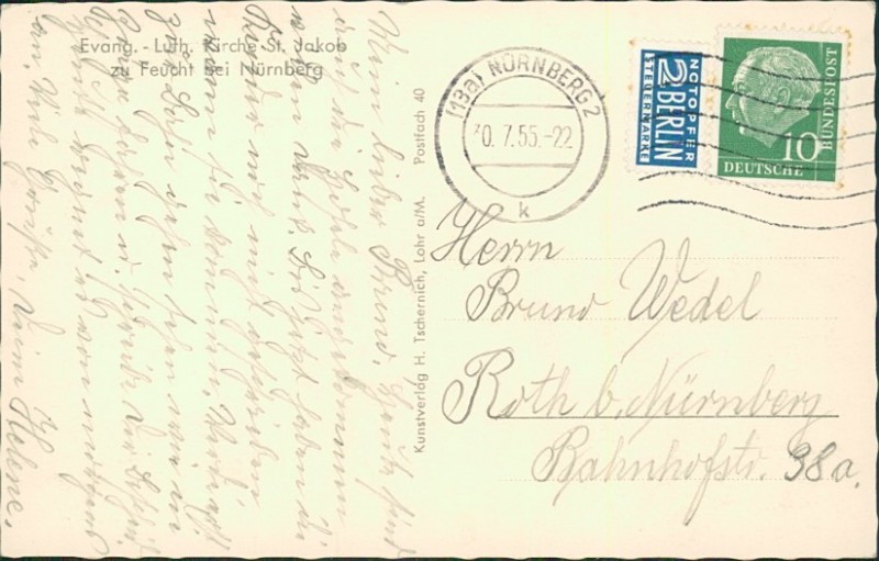 Alte Ansichtskarte aus Feucht, gelaufen am 30.07.1955 von Nürnberg nach Roth b. Nürnberg.