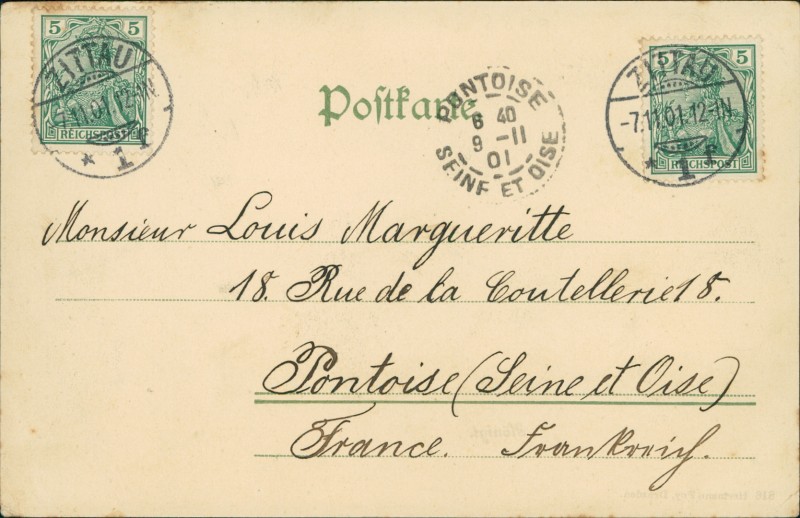 Alte Ansichtskarte aus Zittau, gelaufen am 07.11.1901 von Zittau nach Pontoise. Ankunft in Pontoise am 09.11.1901.