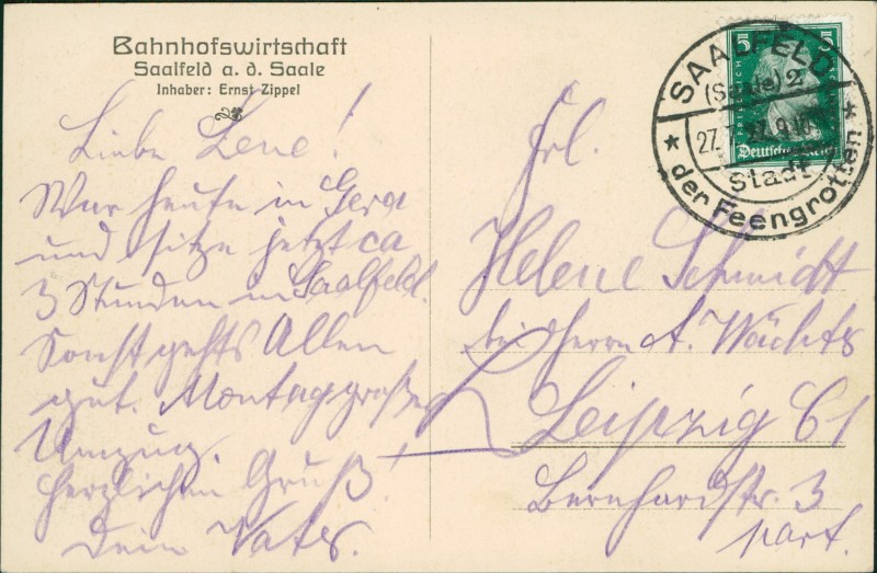 Alte Ansichtskarte aus Saalfeld/Saale, gelaufen am 27.07.1927 von Saalfeld nach Leipzig.