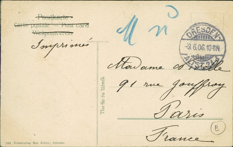 Alte Ansichtskarte aus Dresden, gelaufen am 03.06.1906 von Dresden nach Paris.