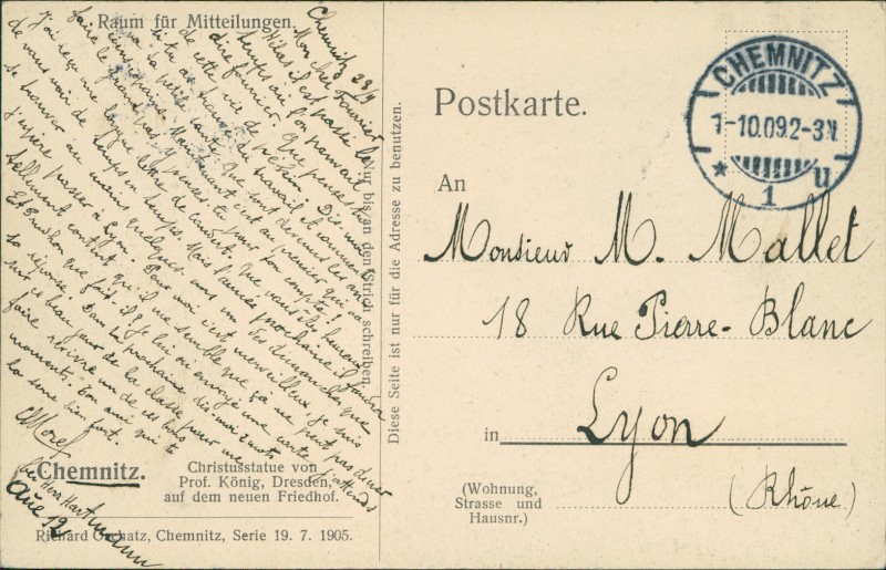 Alte Ansichtskarte aus Chemnitz, gelaufen am 01.10.1909 von Chemnitz nach Lyon.