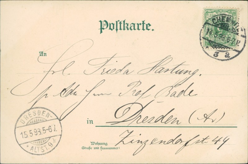 Alte Ansichtskarte aus Chemnitz, gelaufen am 14.05.1898 von Chemnitz nach Dresden (A.). Ankunft in Dresden (A.) am 15.05.1898.