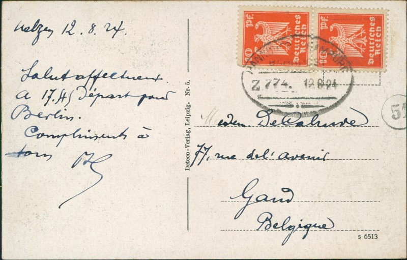 Alte Ansichtskarte aus Uelzen, gelaufen am 12.08.1924 von Hannover-Hamburg (Bahnpost) nach Gand.