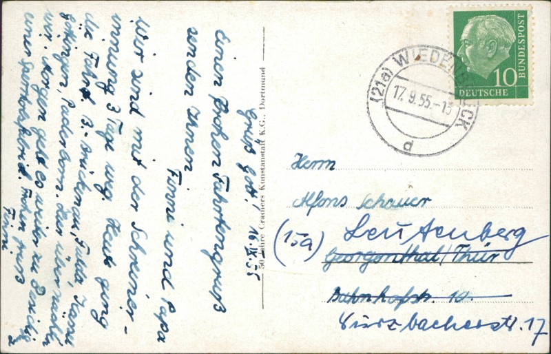 Alte Ansichtskarte aus Rheda-Wiedenbrück, gelaufen am 17.09.1955 von Wiedenbrück nach Leutenberg.