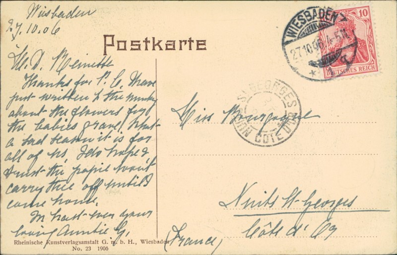 Alte Ansichtskarte aus Wiesbaden, gelaufen am 27.10.1906 von Wiesbaden nach Nuits-St-Georges.