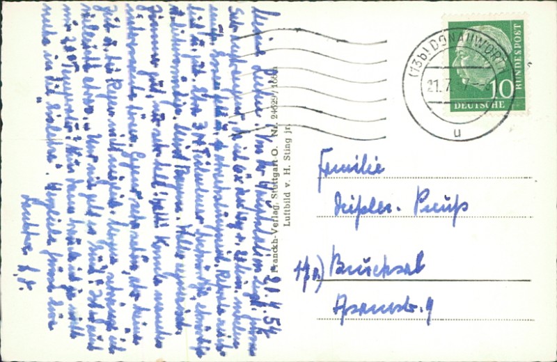 Alte Ansichtskarte aus Donauwörth, gelaufen am 21.07.1957 von Donauwörth nach Bruchsal.