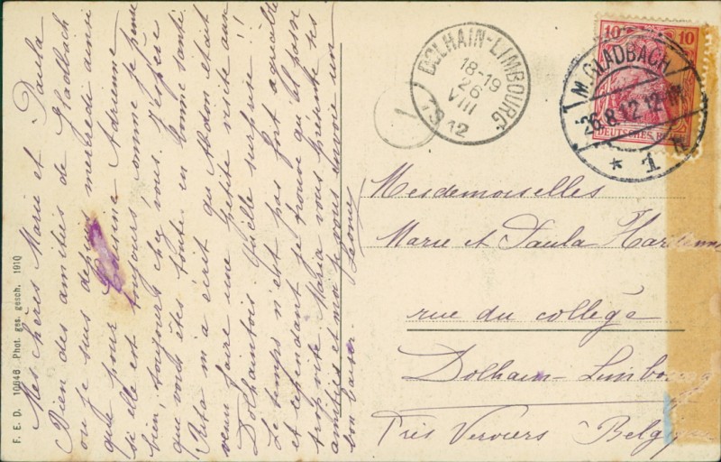 Alte Ansichtskarte aus Mönchengladbach, gelaufen am 26.08.1912 von M.Gladbach nach Dolhain. Ankunft in Dolhain am 26.08.1912.