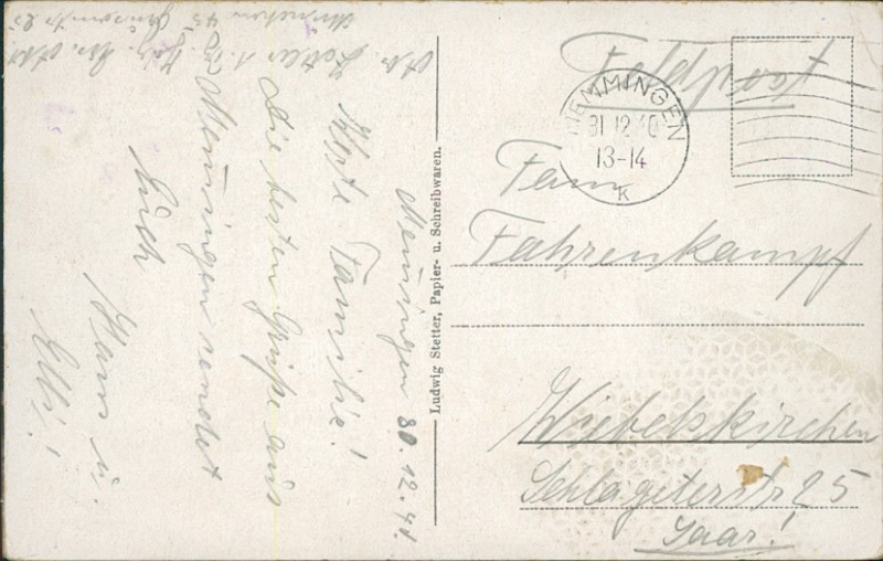 Alte Ansichtskarte aus Memmingen, gelaufen am 31.12.1941 von Memmingen nach Wiebelskirchen.