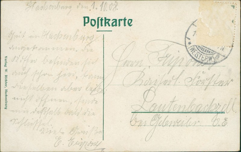 Alte Ansichtskarte aus Hachenburg, gelaufen am 01.10.1908.