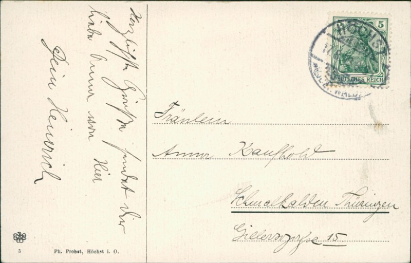 Alte Ansichtskarte aus Höchst i. Odw., gelaufen am 17.08.1919 von Höchst (Odenwald) nach Schmalkalden Thüringen.