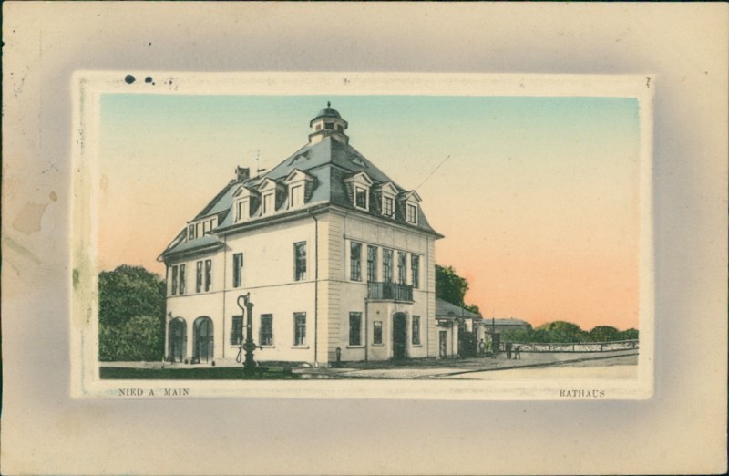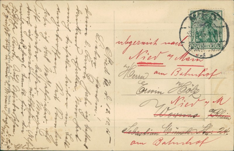 Alte Ansichtskarte aus Frankfurt-Nied, gelaufen am 13.10.1915 von Nied nach Worms.