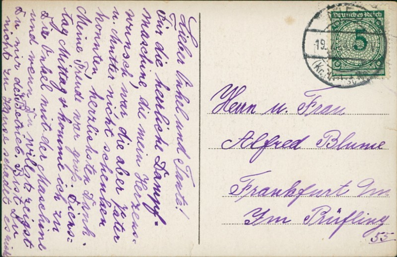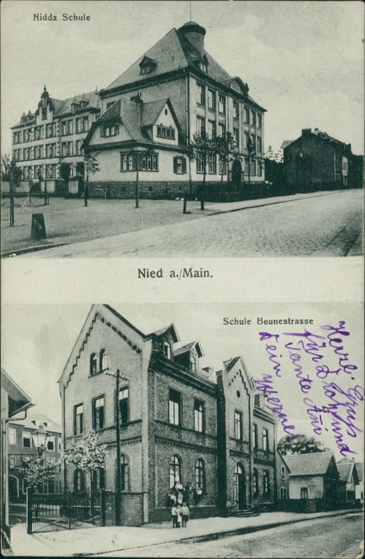 Alte Ansichtskarte aus Frankfurt-Nied, gelaufen am 19.07.1924 von Nied nach Frankfurt.