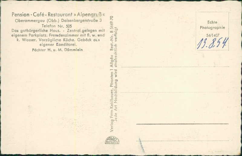 Alte Ansichtskarte aus Oberammergau, beschrieben am 13.08.1954.